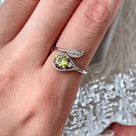 Vintage Olive Green Birthstone Cocktail Ring - Asymmetric Silver Leaf Vine Open Ring