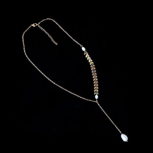 14K Gold Real Pearl Necklace, 2 Way Y Lariat Necklace, Ear of Wheat Necklace, Olive Leaf Vine Necklace, Dainty Curving Bar Layering Necklace
