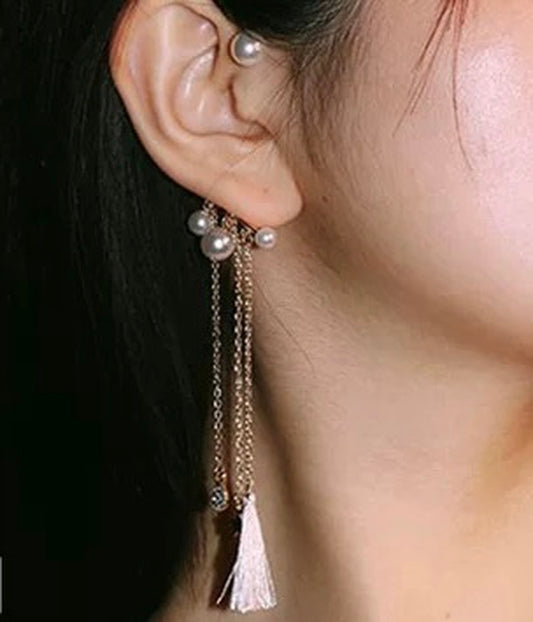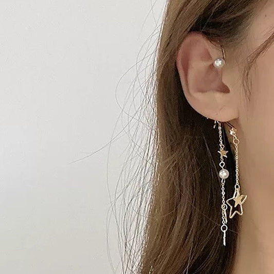 No piercing bohemian ear wrap, Pearl ear wrap, Long tassel dangle earrings, Gold star ear wrap, Dangly gold ear wrap, Delicate long ear wrap