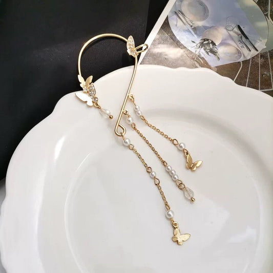 No Pierce Gold Butterfly Dangle Ear Wrap | Bohemian Long Pearl Tassel Charm Ear Climber Cuff