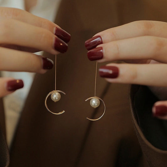 No piercing dangle earrings, Semicircle gold hoop earrings, Natural ivory pearl statement earrings, Non pierced clip on earrings, Geometric
