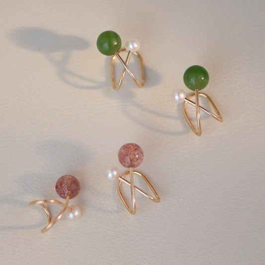 No piercing clip on ear studs, Intercross gold pearl earrings, Helix ear bone cuff climber, Pink and green stud earrings,Non pierced jewelry