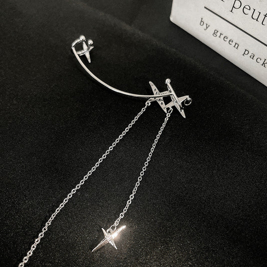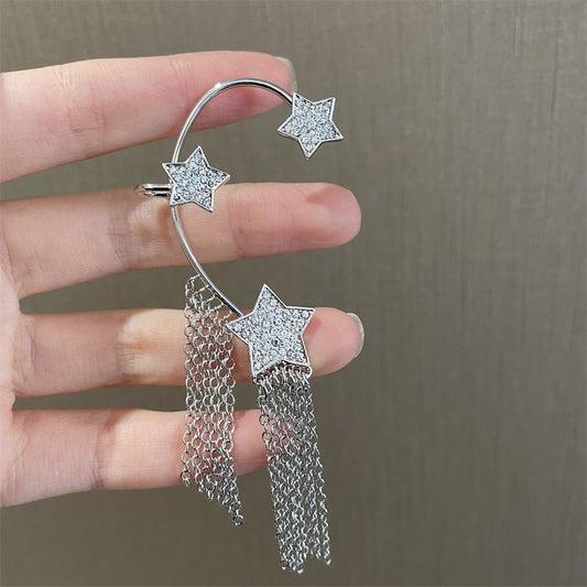 North Star Dangle No Piercing Ear Cuff | Silver Starburst Cluster Long Tassels Earrings