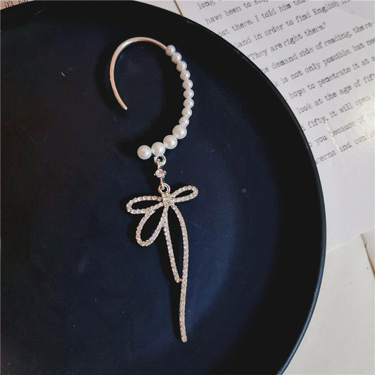 No piercing ribbon earrings, Silver pearl ear cuff climber, Non pierced cuff earrings, CZ pearl ear cuff, Long tassel dangle cuff earrings