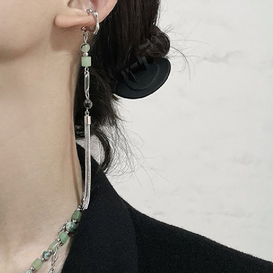 No piercing jade earrings, Long tassel dangle earrings, Ear cuff climber, Silver statement earrings, Green jade bead earings, Gift for mom