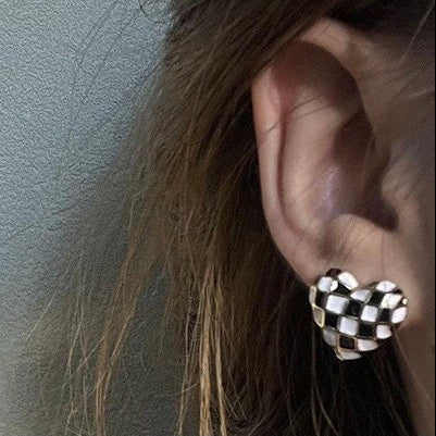 Black White Checkerboard Heart Studs - Chunky Statement Stud Earrings