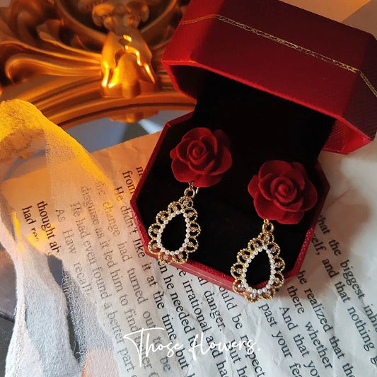 Beauty and the Beast Princess Earrings - Victorian Romantic Red Velvet Rose Earrings
