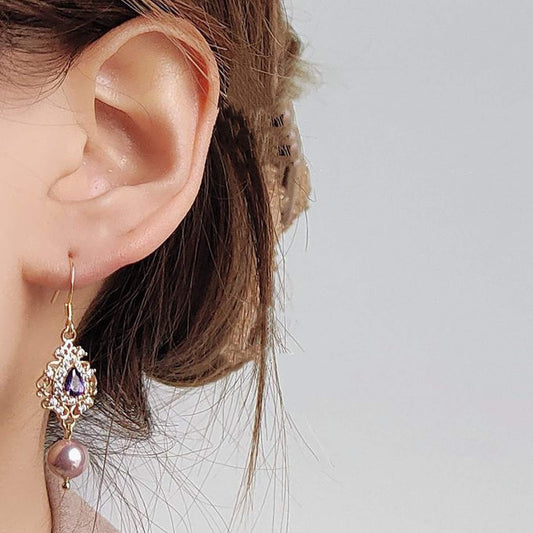Purple Pearl Amethyst Teardrop Earrings - Purple Gold Lace Bridesmaid wedding Earrings