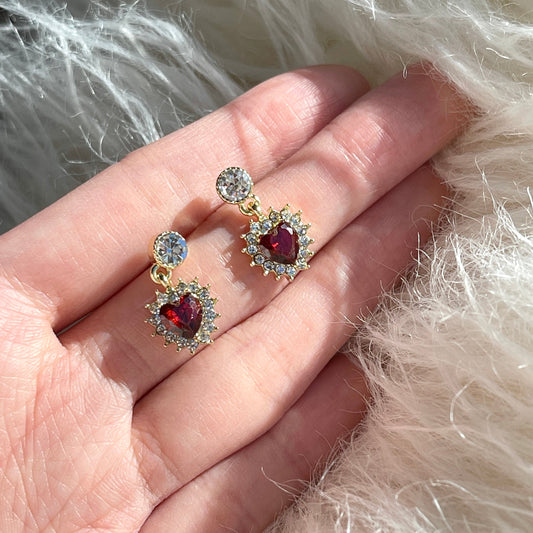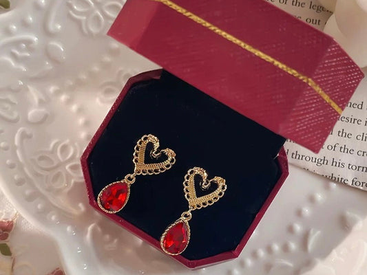 Red Heart Earrings, Gold Lace Earrings, Ruby Gemstone Earrings, Romantic Heart Stud, Vinatge Earrings, Bridesmaid Wedding Anniversary Gift