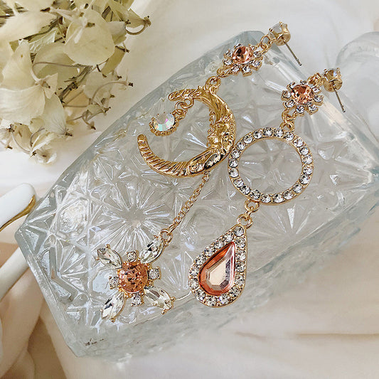 Baroque Vintage Long Drop Mismatched Earrings - Feminine Pink Gold Crescent Statement Earrings