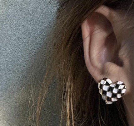 Black White Checkerboard Heart Studs - Chunky Statement Stud Earrings