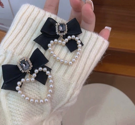 Balletcore Black Silk Ribbon Earrings | Bow Statement Pearl Heart Hoop Earrings