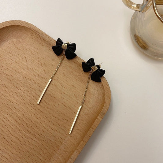 Black Ribbon Bow Gold Earrings | 2-Way Versatile Dangle Drop Earrings | Girly Romance