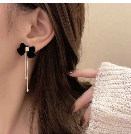 Balletcore Black Ribbon Bow Earrings | Handmade 2-Way Black Velvet Gold Tassel Earrings