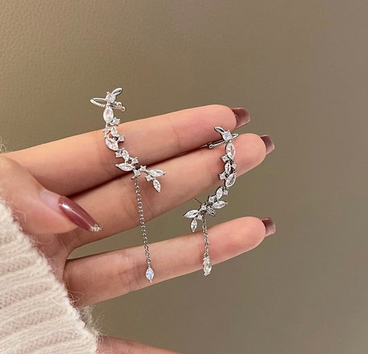 Silver lvy vine cuff climber, Dainty ear cuff wrap, Dangly drop Cz ear crawler, Minimalist conch ear cuff, Handmade delicate silver earrings
