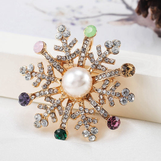 Sparkling Snowflake Brooch, Winter Holiday Christmas Accessory Jewelry, Gold Pearl Cubic Zirconia Brooch, Handmade Christmas Gift for women