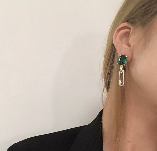 Creative Silver Pin Emerald Green Gemstone Earrings - Avant Garde Chunky Statement Earrings