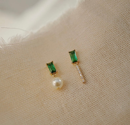Emerald natural pearl earrings, Mismatched gold emerald green earrings, Dainty emerald earrings, Bridesmaids bridal wedding earrings gift