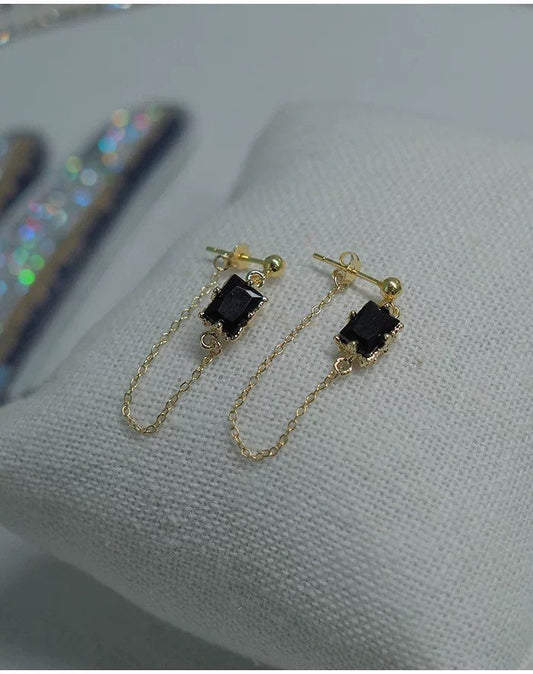 Green Emerald|Black Gemstone Earrings, Interlocking Earrings, 14K Gold Link Chain Cuff Earrings, Threader Earrings, Gothic Vintage Earrings