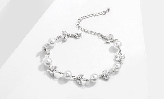 Pearl crystal bracelet, Bridal bridesmaid pearl bracelet, Crystal diamond pearl bracelet, Leaf floral pearl bracelets, Wedding jewelry gift