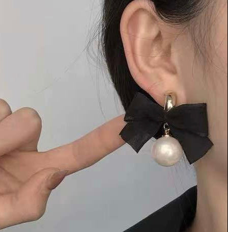 Handmade Black Silk Ribbon Bow Earrings | Romantic Elegant Pearl Drop Earrings Half Gold Hoop Earrings