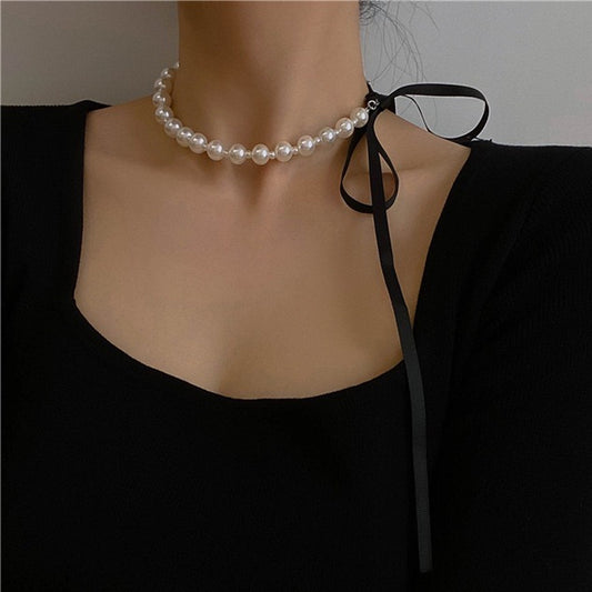 Audrey Hepburn Black Silk Bow Ribbon Pearl Necklace | Handmade Vintage Style Pearl Drop Long Necklace