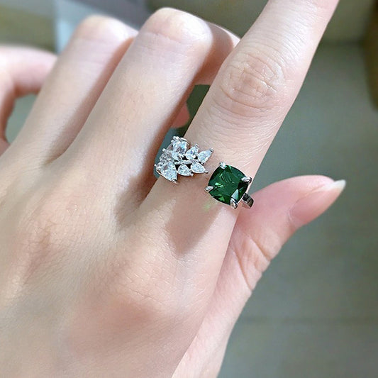 Celebrity Style Cushion Cut Emerald Ring - Green Leaf Diamond Ring