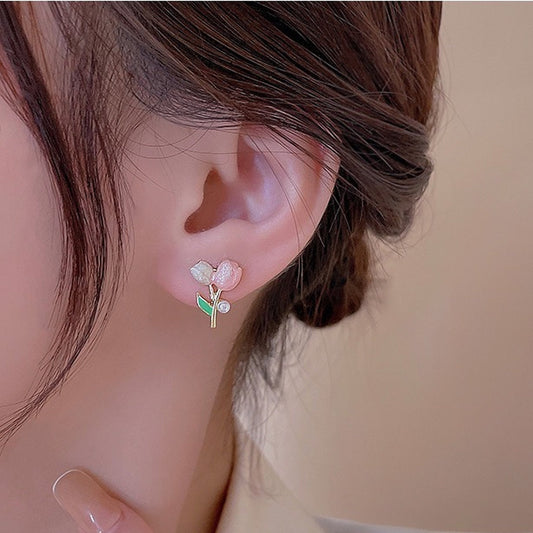 Cute Pastel Pink Tulip Stud Earrings - Fairycore Tulip Flower Stem Jewelry