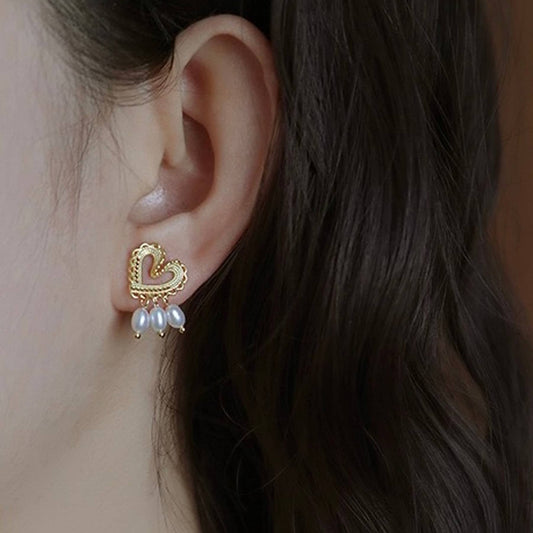 Romantic Heart Gold Lace Earrings | Freshwater Pearl Hoop Tassel Earrings